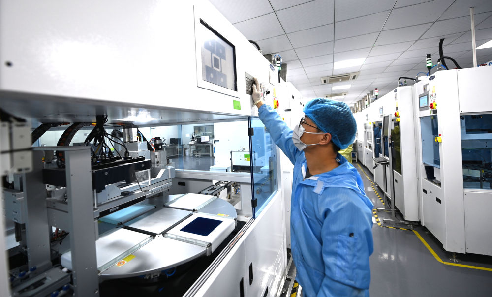 在杭州市富阳区春江街道富春湾新城的杭州正银电子材料有限公司的研发实验室内,自动化设备在进行光伏板的丝网印刷(3月22日摄)。