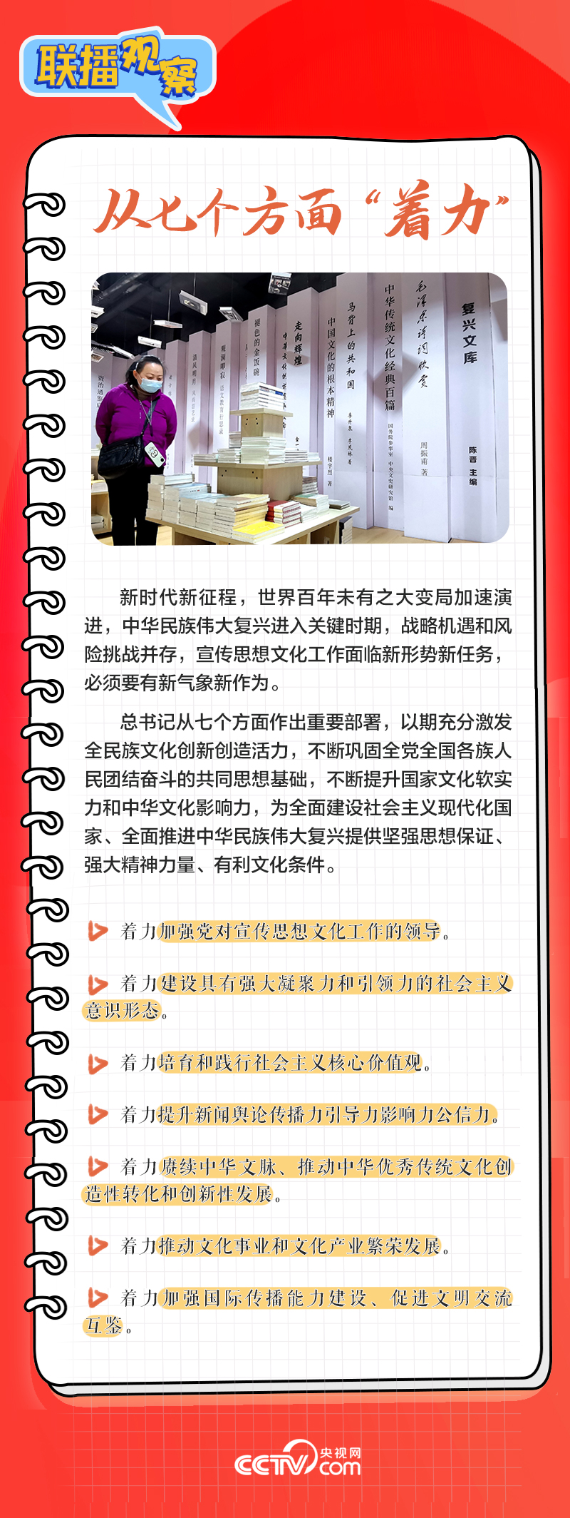 近日,习近平总书记对宣传思想文化工作作出重要指示,提出“新的文化使命”“首要政治任务”等论断,并要求从七个方面着力,为全面建设社会主义现代化国家、全面推进中华民族伟大复兴提供坚强思想保证、强大精神力量、有利文化条件。