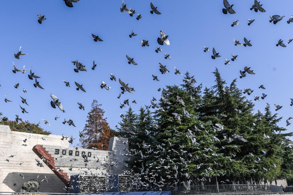 2022年12月13日,南京大屠杀死难者国家公祭仪式现场放飞和平鸽。 新华社记者李博 摄