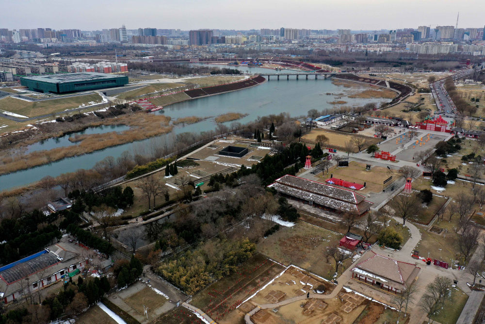 这是隔河相望的河南安阳殷墟宫殿宗庙遗址(右)与殷墟博物馆新馆(无人机照片,2024年2月23日摄)。新华社记者 李安 摄