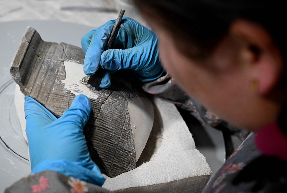 在中国社会科学院考古研究所安阳工作站,工作人员在对殷墟洹北商城出土的陶片进行整理修复(2024年2月23日摄)。新华社记者 李安 摄