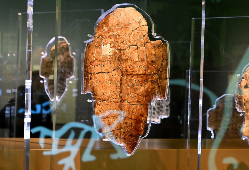 这是河南安阳殷墟博物馆新馆内展出的刻辞卜甲(2024年2月23日摄)。新华社记者 李安 摄