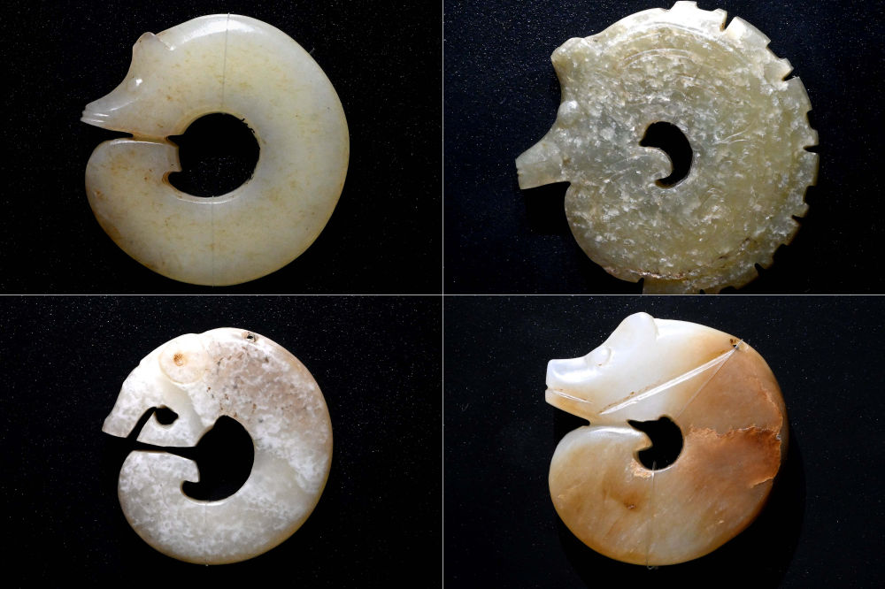 这是河南安阳殷墟博物馆新馆内展出的龙形玉玦(拼版照片,2024年1月9日摄)。新华社记者 李安 摄