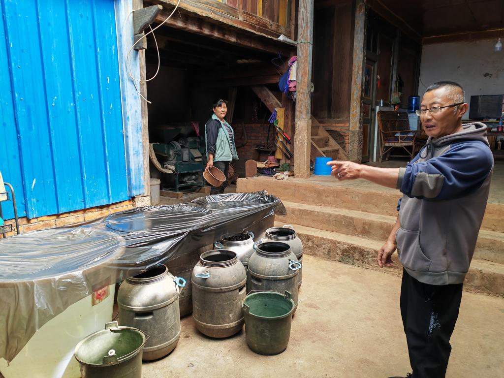 3月14日,元江县洼垤乡老茶己村村民龙玉春(右)在家里介绍储水情况。新华社记者林碧锋 摄