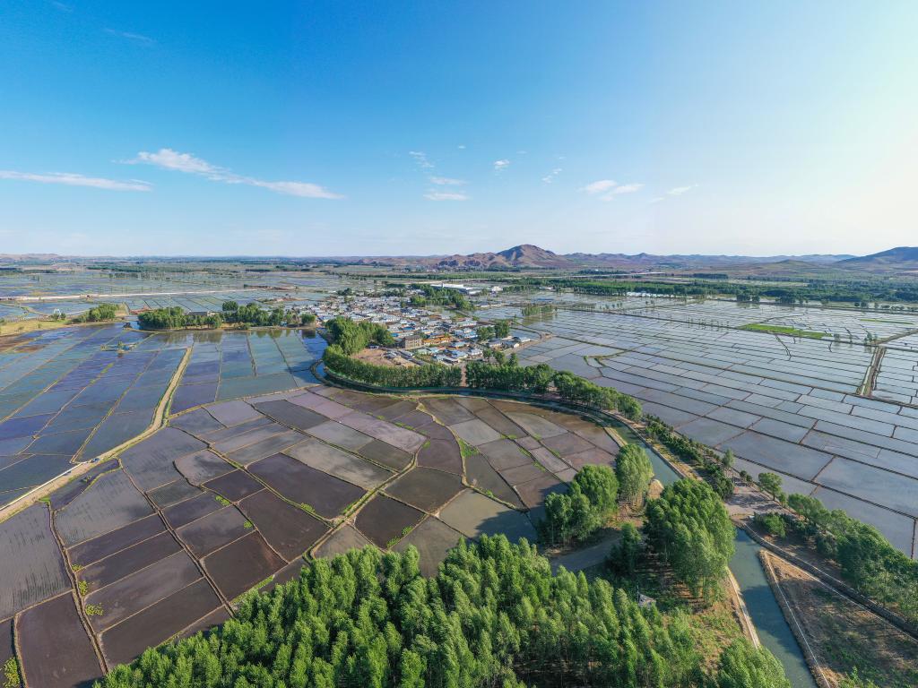夏日,乌兰浩特市乌兰哈达镇三合村稻田风光秀美,一台台满载秧苗的插秧机在田间来回穿梭。一会工夫,稻田披上了绿色的新装。
